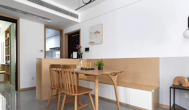 餐廳呢因?yàn)榭臻g限制,選擇了卡座和原木桌椅結(jié)合的方式,卡座同時(shí)也是一排抽屜,可以存放一些坐墊、桌墊等物品,左側(cè)的鞋柜還可以充當(dāng)隔段的作用,使其與大門隔開,有了空間的層次