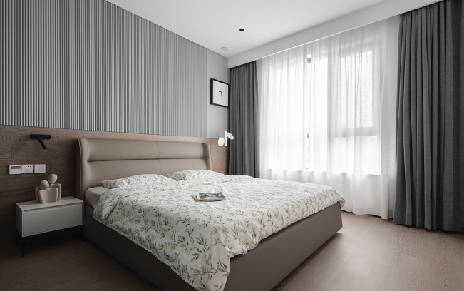 臥室依舊沿用無主燈設(shè)計,以壁燈和吊線燈做非對稱設(shè)計,讓空間表現(xiàn)更為靈動。