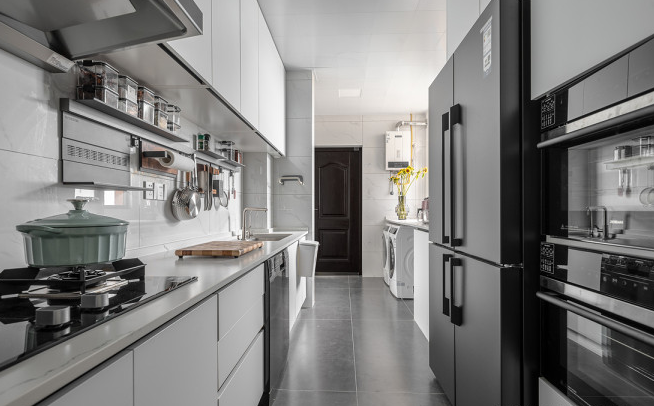 打通原始洗衣房與廚房隔墻,增加空間通透性。做兩側(cè)一字型柜體設(shè)計,左側(cè)為廚房操作區(qū)域,右側(cè)為冷藏洗衣區(qū)。