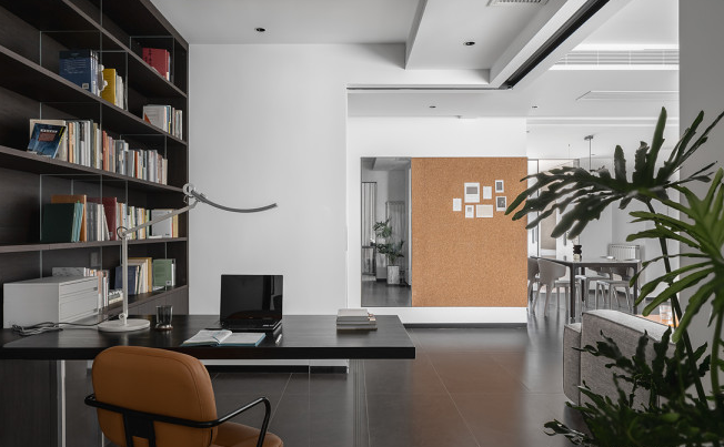 書房墻面材質(zhì)和地面材質(zhì)和客餐廳相統(tǒng)一,書桌選用一張整板搭配亞克力桌腿和書柜形成統(tǒng)一,以一種自然輕盈的藝術(shù)形態(tài)在空間里靜立。