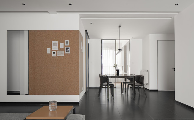 入戶左側(cè)墻體以穿衣鏡與軟木裝飾,延伸至餐廳區(qū)域,使空間在視覺上更具延續(xù)感,軟木材質(zhì)的溫潤給予空間溫度的同時,后期也可作為寶寶成長記錄的溫馨一角。